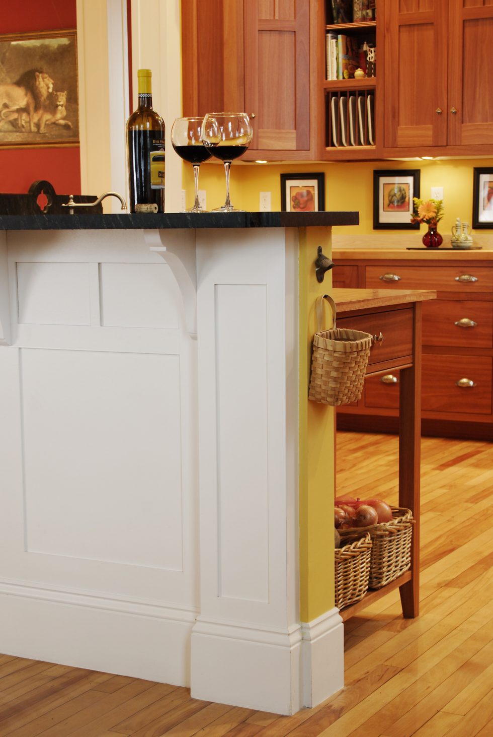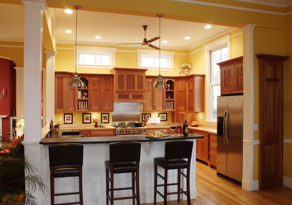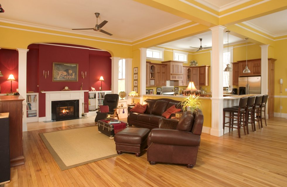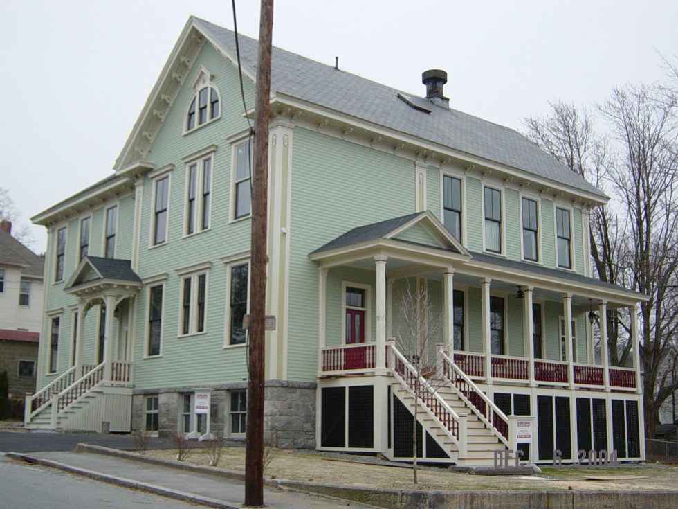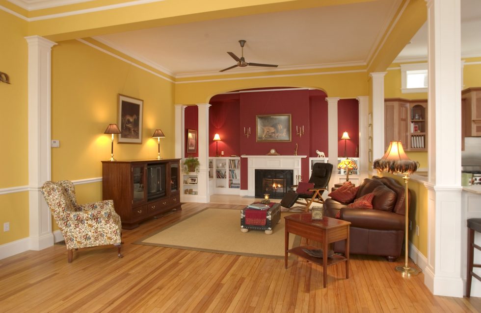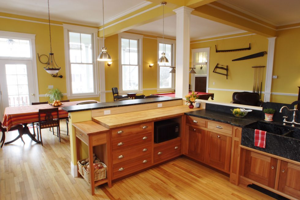 ACS expanded this opening by creating a full-width porch with sweeping sunset views of the Merrimack Valley. This gave the large building a more residential feel and enhanced its separate entrances, which converted well into two residential condominium units. The renovation included removing overlaid siding and replicating missing trim and other Italianate details such as scrolled brackets, paneled corner boards, and decorative window hoods. Inside, walls were removed to create an open, light-filled environment for kitchen, dining, and entertainment areas.